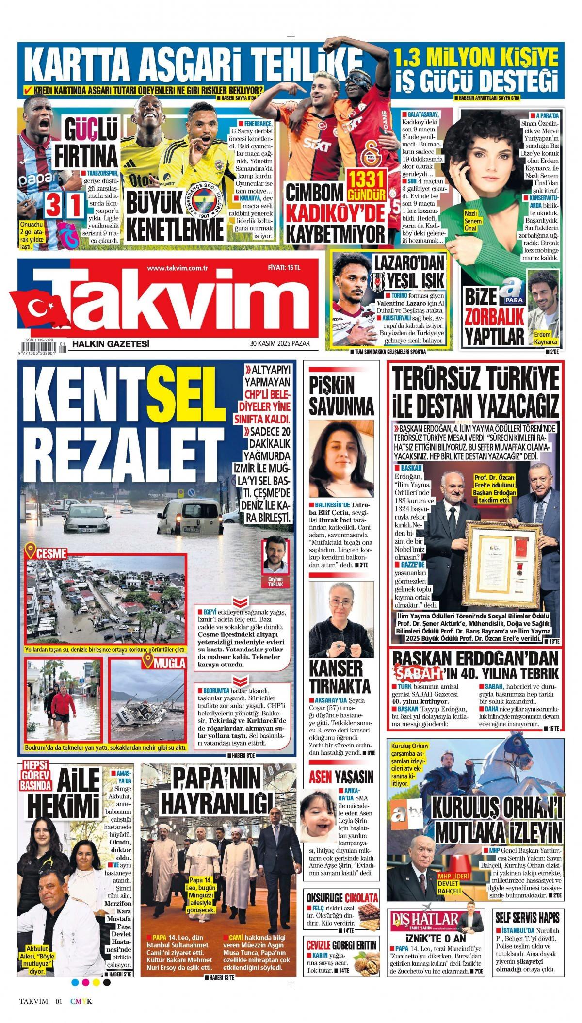 Takvim Gazetesi 1 Aralık 2025 Günü Gazete Manşetleri