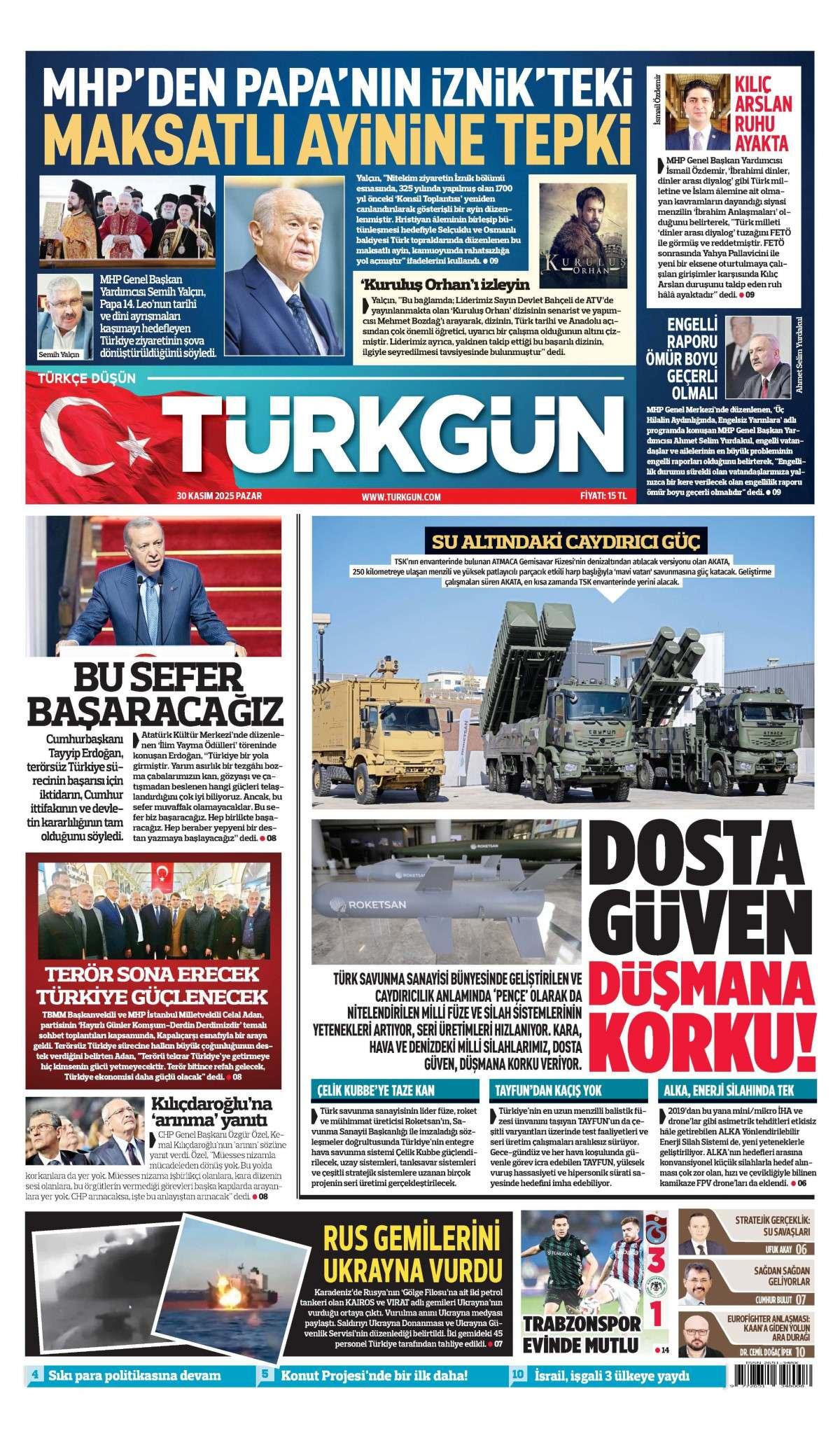Türkgün Gazetesi 1 Aralık 2025 Günü Gazete Manşetleri
